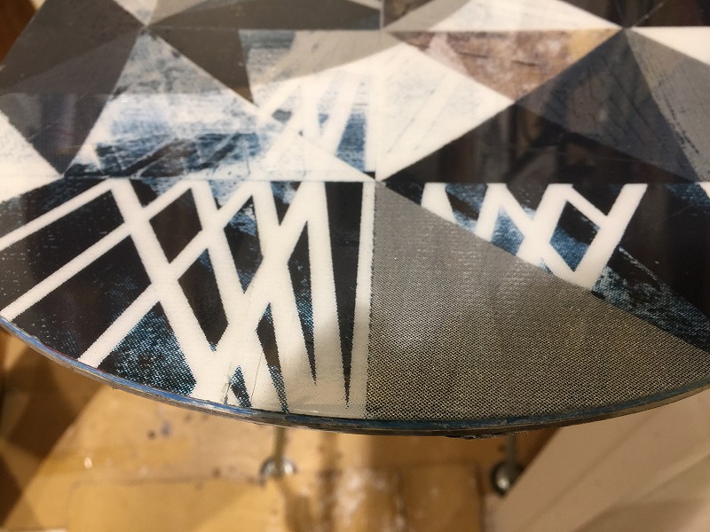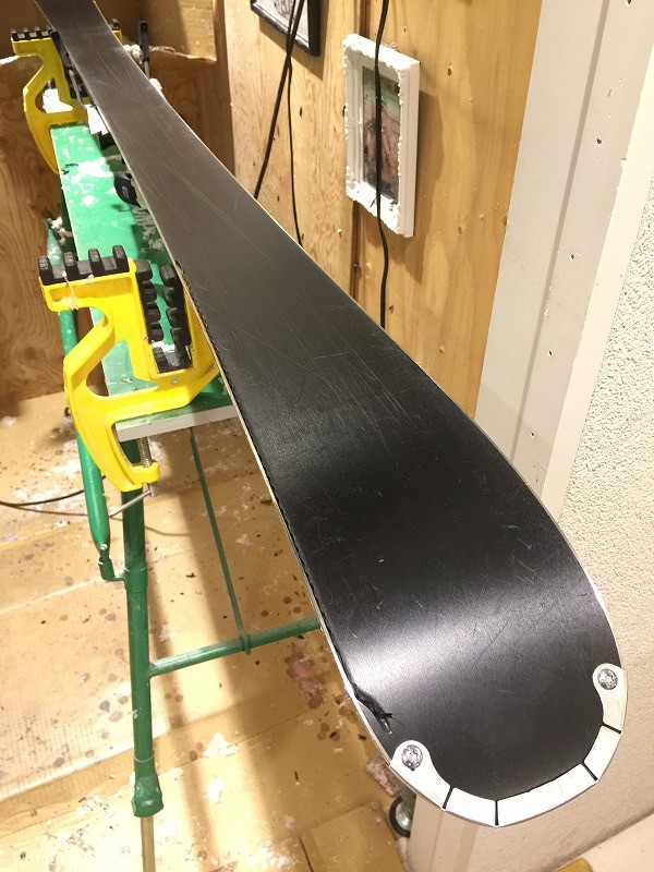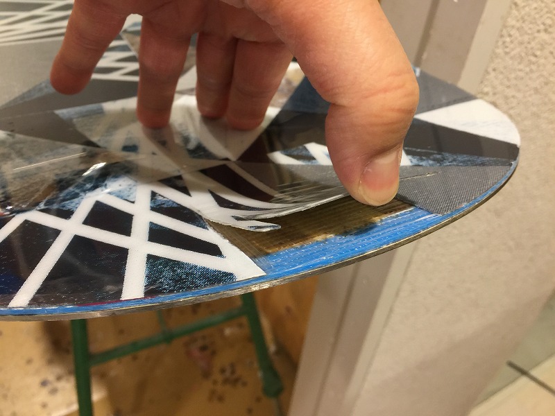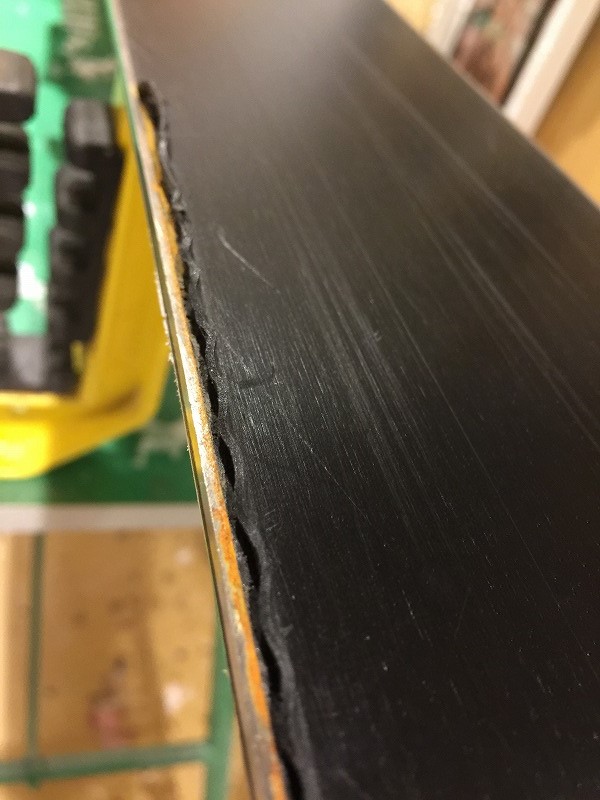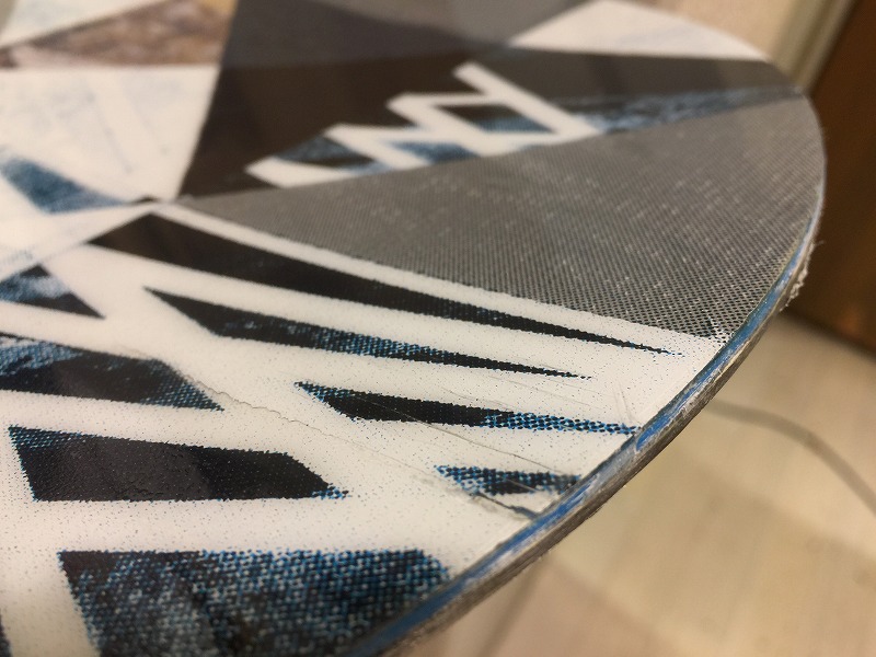 バタバタしていて修理前の写真を撮り忘れてしまって。。写真の左側はめくれ上がってしまい、右半分はトップシート素材は紛失で芯材が丸見えの状態でした、YONEXのボードですので、WOODコア(木)ではなく、カーボン繊維が出てしまっておりました。