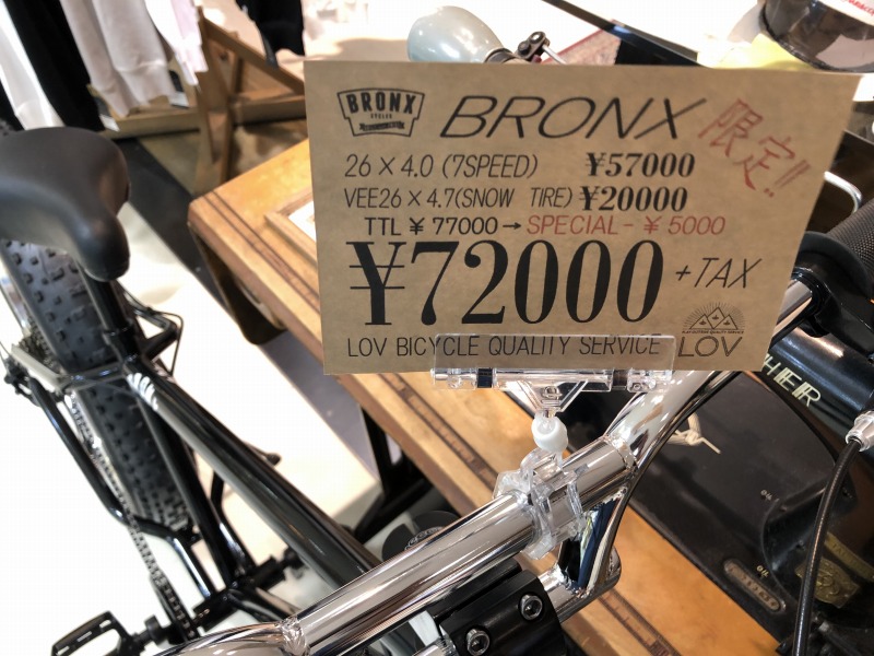 先日のブログでご案内したBRONXファットバイクのタイヤカスタムモデルですが、台数限定での当店のみのキャンペーンですので、BRONX取扱店舗の他店に問い合わせても「??」です。