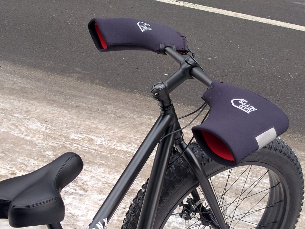 ↑画像で付けているハンドルカバーは完成車には含まれません、ですがこれが一回使うと手が暖かすぎて抜け出せなくなるのでオススメです!BARMITTS mountain mitts ¥9900