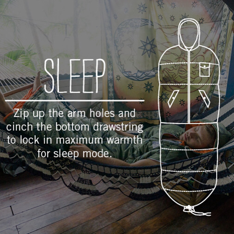 写真のように手足を出して使えて手のジップを締めて、裾を絞って寝ることもできる。何よりも他のブランドと違うのはこのデザイン性ですね、とにかくおしゃれでどんなシーンでも「絵」になってしまいます!